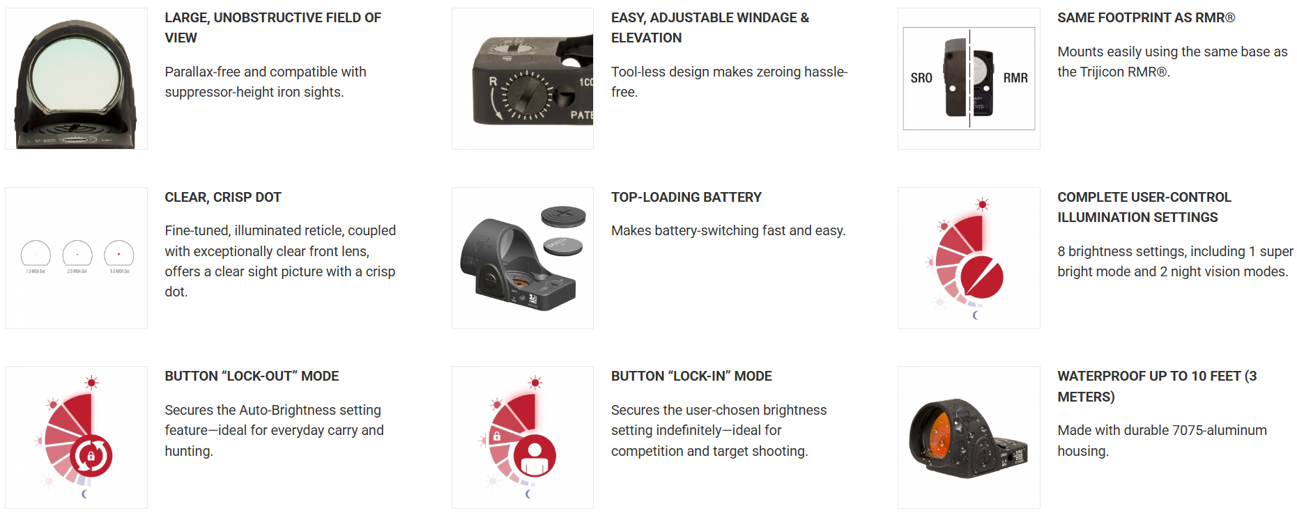 Kolimator Trijicon SRO został zaprojektowany z myślą o legendarnej trwałości marki Trijicon, co czyni go odpornym na trudne warunki użytkowania zarówno na strzelnicy, jak i poza nią. Oto niektóre z jego kluczowych funkcji: