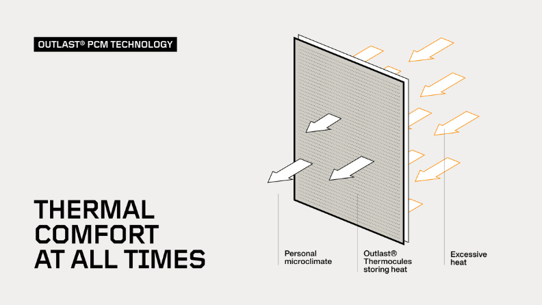 Outlast® to inteligentna technologia zarządzania temperaturą ciała, która pomaga utrzymać optymalny mikroklimat pomiędzy kamizelką a użytkownikiem.