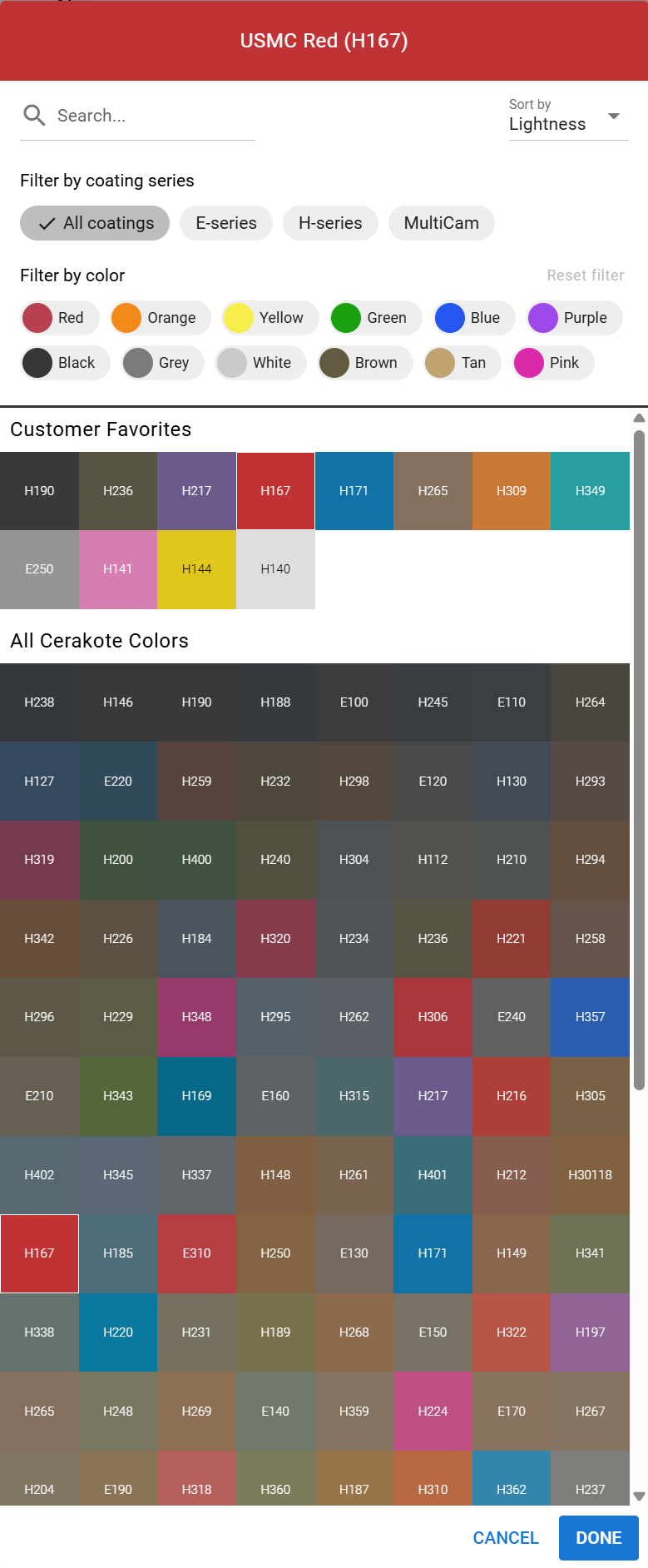 Kreator dostępny na stronie producenta pozwala na szeroki zakres modyfikacji naszego pistoletu. Zaczynając od długości, lufy, stylu zamka, tekstury chwytu, szyny akcesoryjnej czy lejka aż po kolorystykę każdego z elementów. Szeroki zakres dostępnych farm Cerakote