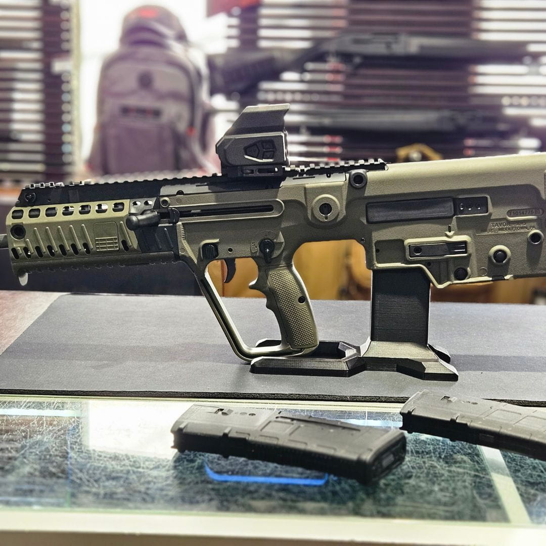 Podstawka została zaprojektowana z myślą o karabinach różnych producentów, takich jak Colt, IWI, S&W, Schmeisser czy Taurus, co czyni ją uniwersalnym rozwiązaniem dla wielu użytkowników. Wykonana z trwałych materiałów ABS lub PETG, w zależności od koloru uchwytu, gwarantuje długotrwałe użytkowanie i odporność na uszkodzenia.