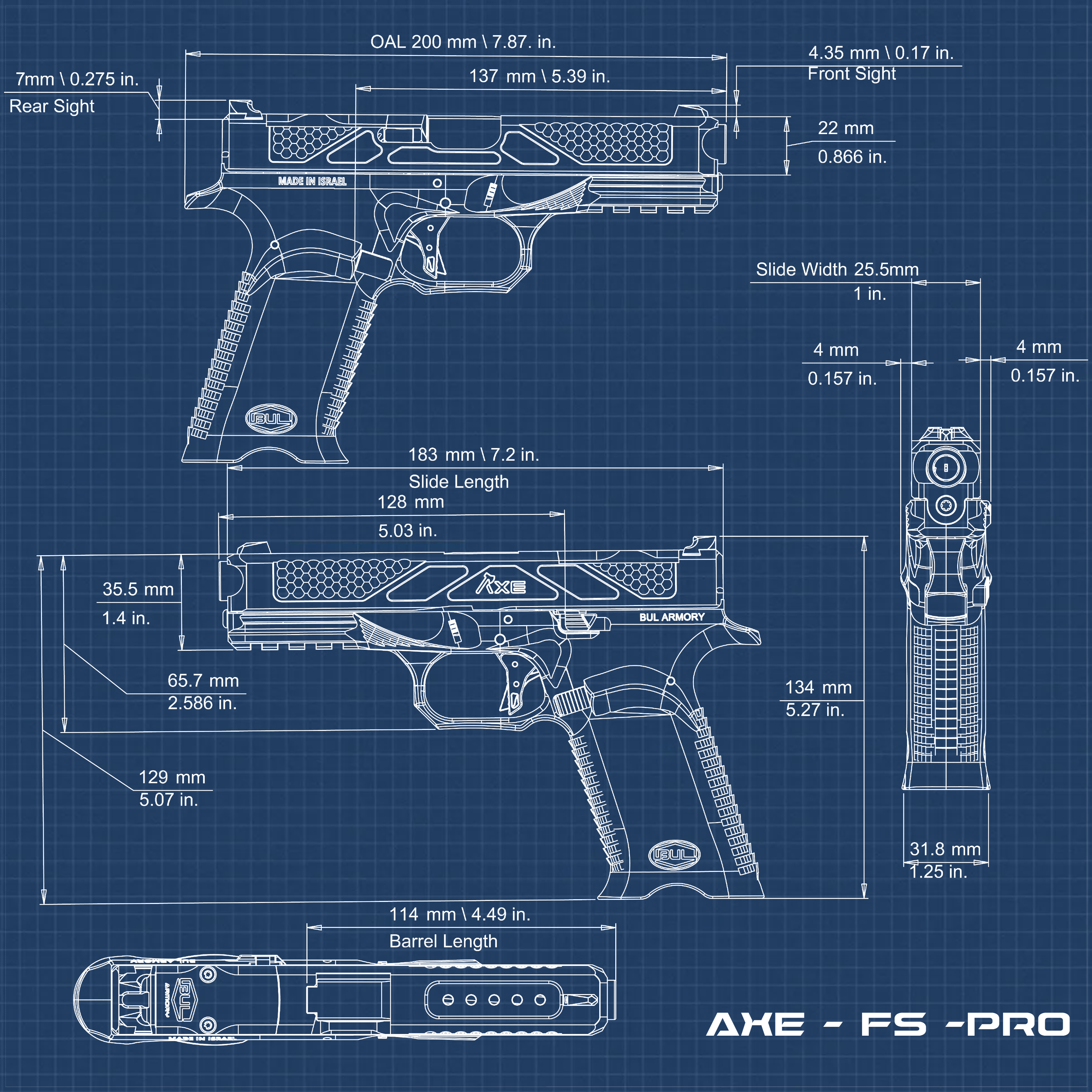 BUL Armory pracowało intensywnie nad tym, by ich pierwszy pistolet bezkurkowy - AXE był najlepszy w swojej klasie, dorównując legendzie innych konstrukcji producenta. AXE oparty jest o platformę Glock generacji 3, przewyższając i rozwijając oryginał niemal pod każdym względem, zachowując jednak pełną kompatybilność części i magazynków.
